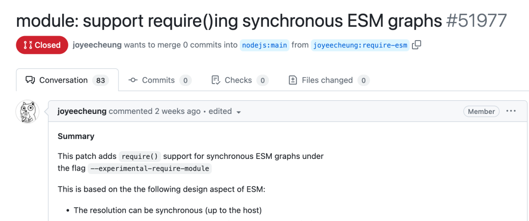 然而,由于历史原因,很多既有代码和第三方库仍依赖于 CommonJS 模块系统,然而因为 ESM 的异步加载的设计,两个模块化方案一直是无法共存的,这也成了很多开发者的一大痛点。