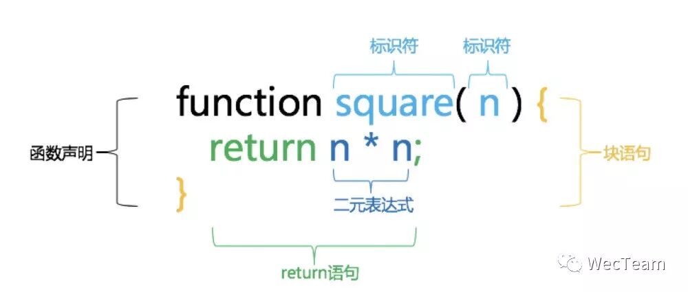 如下图,代码为一个简单的函数声明。词法分析阶段,将代码作为字符串输入获得关键词,图中 function、 square、 (、 )、 {、 }等都被识别为关键词 (稍微回忆下编译原理,字符挨个入栈,符合一定规则即出栈)。语法分析阶段,对关键词的组合形成一个个节点,如 n*n 这 3 个关键词组合成 二元表达式,关键词 return 与二元表达式组合成 return语句。最后组合成一个 函数声明语句。