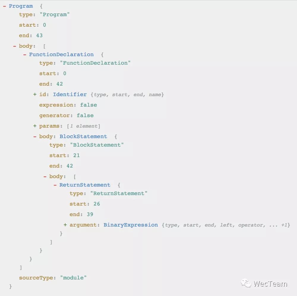 如何获得 AST 已经简单介绍了,那 AST 最终应该以什么样的数据结构存在呢,先看看上述函数声明的 AST 结构