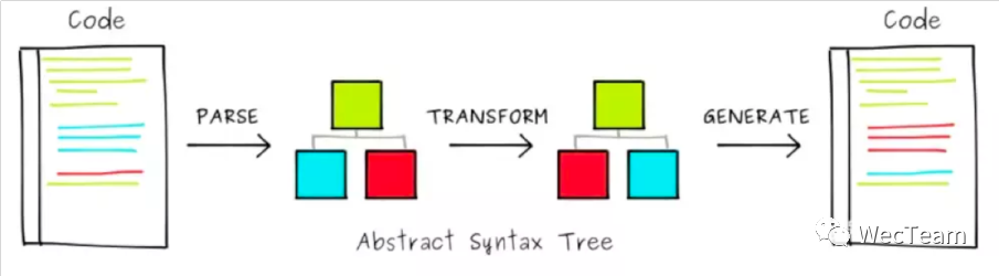 图中树状数据结构即 AST,从这个过程可以看到将代码转成 AST 后,通过操作节点来改变代码。