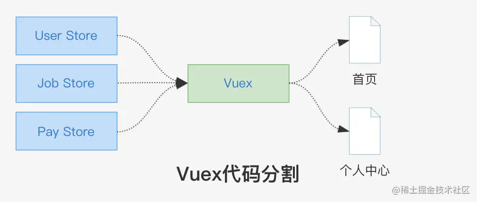 打包时,vuex 会把 3 个 store 合并打包,当首页用到 Vuex 时,这个包会引入到首页一起打包,最后输出 1 个 js chunk。这样的问题是,其实首页只需要其中 1 个 store,但其他 2 个无关的 store 也被打包进来,造成资源浪费。