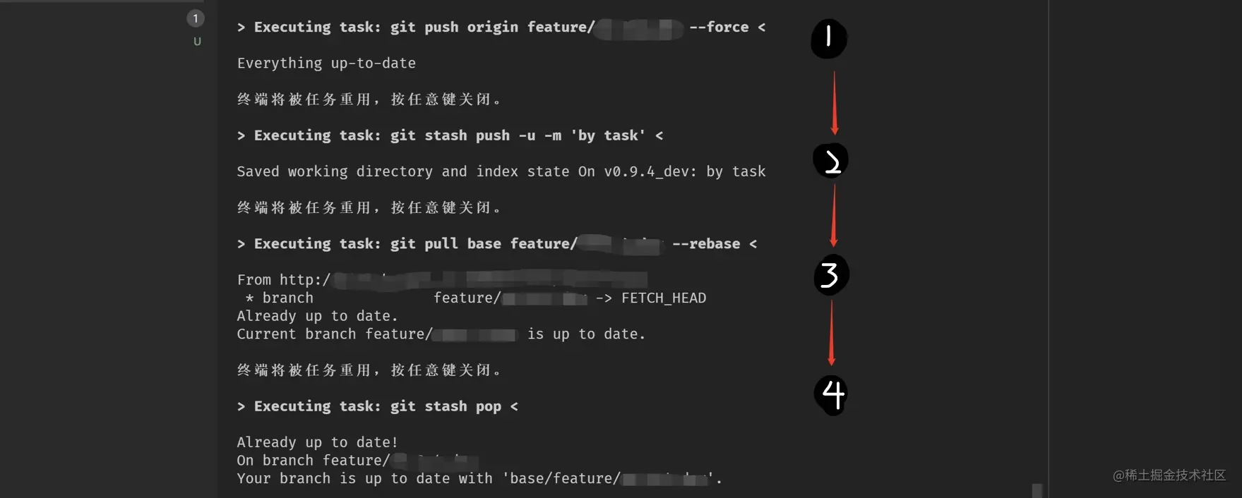 $ git stash push -u -m xxx (将当前未提交的内容存储)$ git pull base --rebase (从主仓库变基拉取代码)$ git push origin --force (向个人仓库推送)$ git stash pop (弹出之前存储的内容)魔法: 熟悉VS Code任务系统的我,在执行以上内容时,只需要两步: